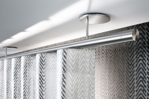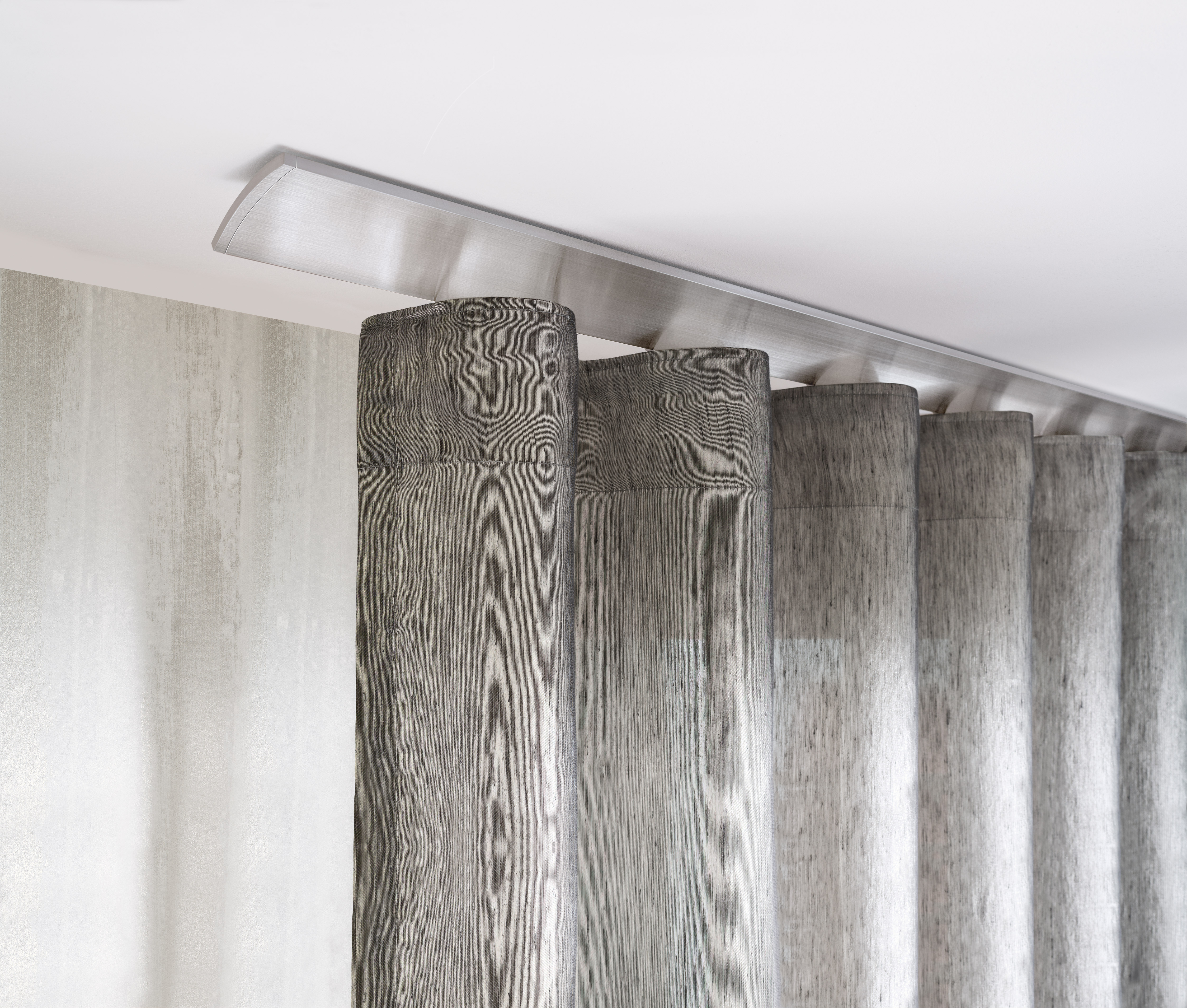Die neue Aufhängetechnik für Wellenvorhänge besticht durch eine konsequent auf den großzügigen und gleichmäßigen Faltenwurf ausgerichtete Formensprache. Damit kommt die zeitgemäße Dekorationsform eindrucksvoll zur Geltung. Raffinierte technische Details zeigen, dass die neuen Wellenvorhangsysteme auch von innen 100% interstil sind: